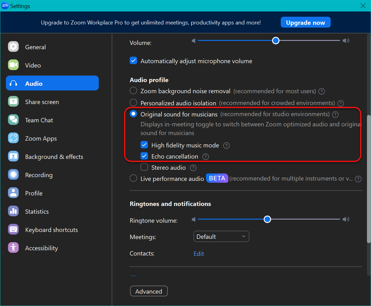 Under Original sound for musicians, enable High fidelity music mode and Echo cancellation.