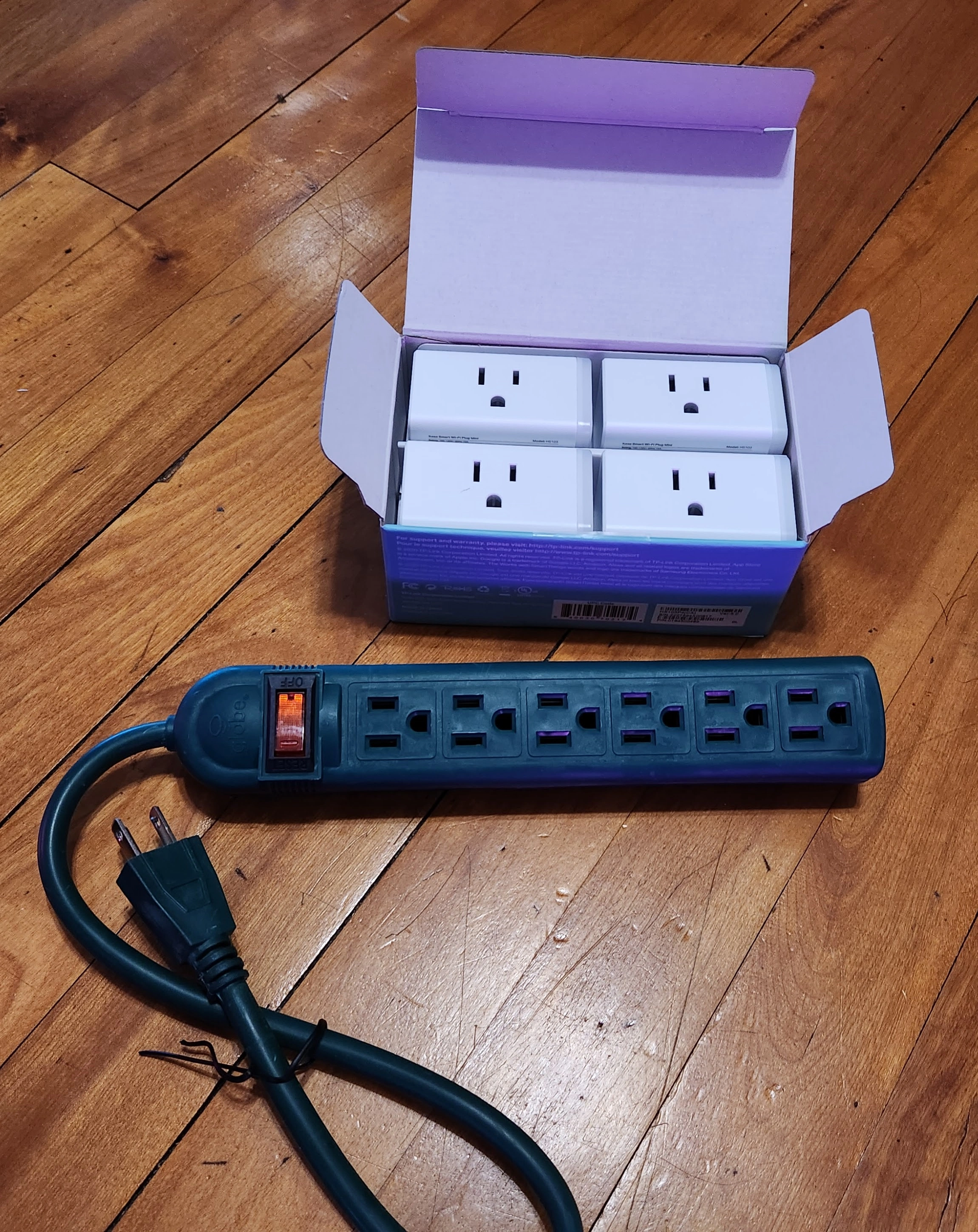 I purchased two 4-packs for a total of 8 voice-controlled A/C outlets for $80 CDN, plus tax. I also purchased 4 six-outlet A/C strips from the local dollar store for $4 CDN each, yielding a total of 24 outlets. $10 per Kasa outlet, amortized across a $4 six-outlet strip, means each switched A/C outlet on a strip costs about $2 plus tax when fully utilized.