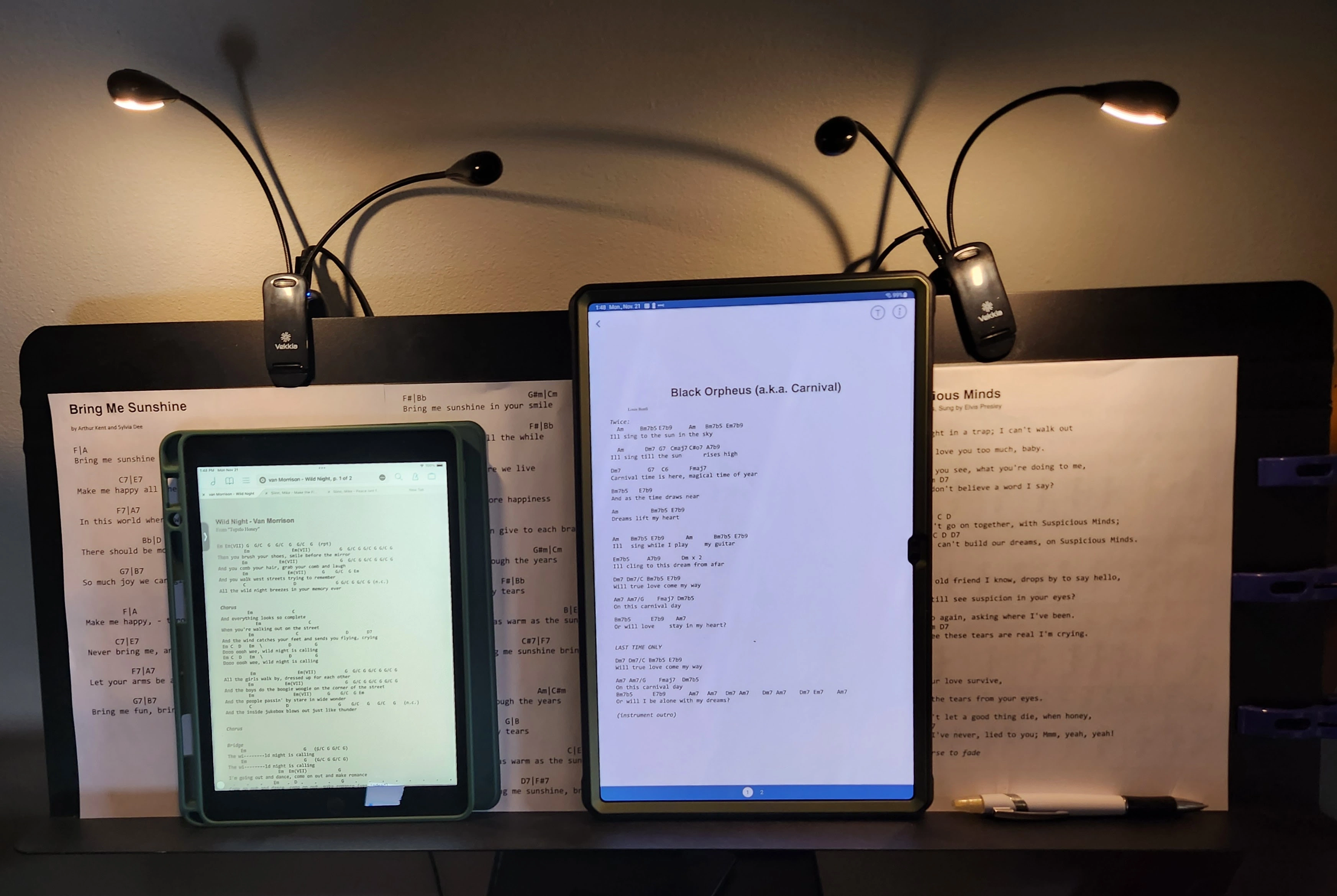 I also place iPads and Android tablets on music stands to display music and lyrics. Tablets can display set lists of PDFs, and they can run sophisticated music apps. When paired with a hands-free page turner, tablets have a significant advantage over printed scores.
