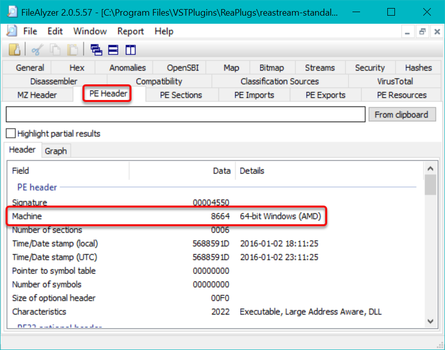 $ pedump --pe my_vst.dll | \ grep 'Machine:' | rev | cut -d' ' -f1 | rev x64