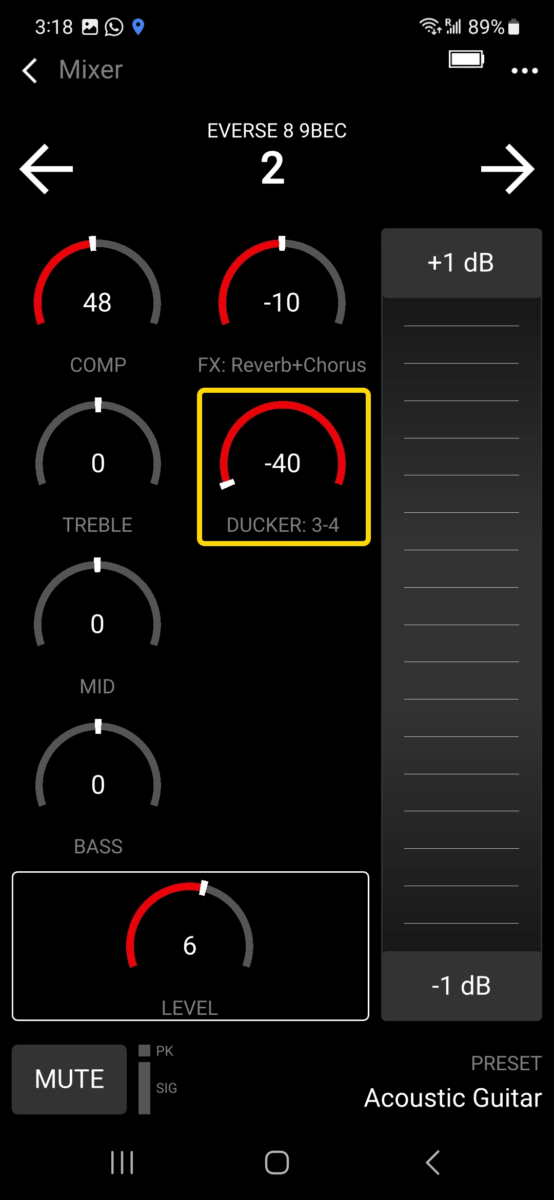 If you find that singing causes your guitar's volume to diminish, ducking is enabled. Ducking is enabled by default.