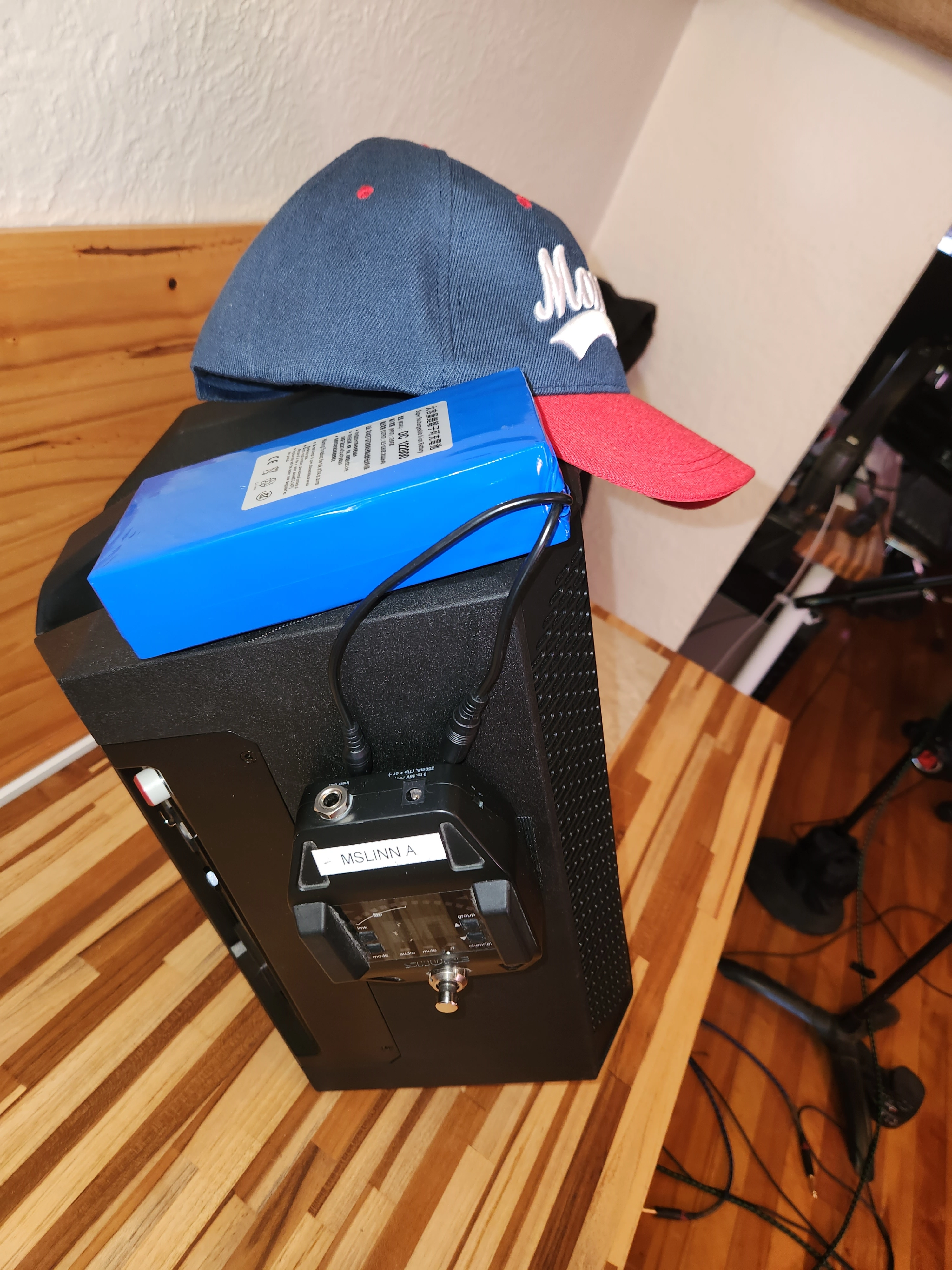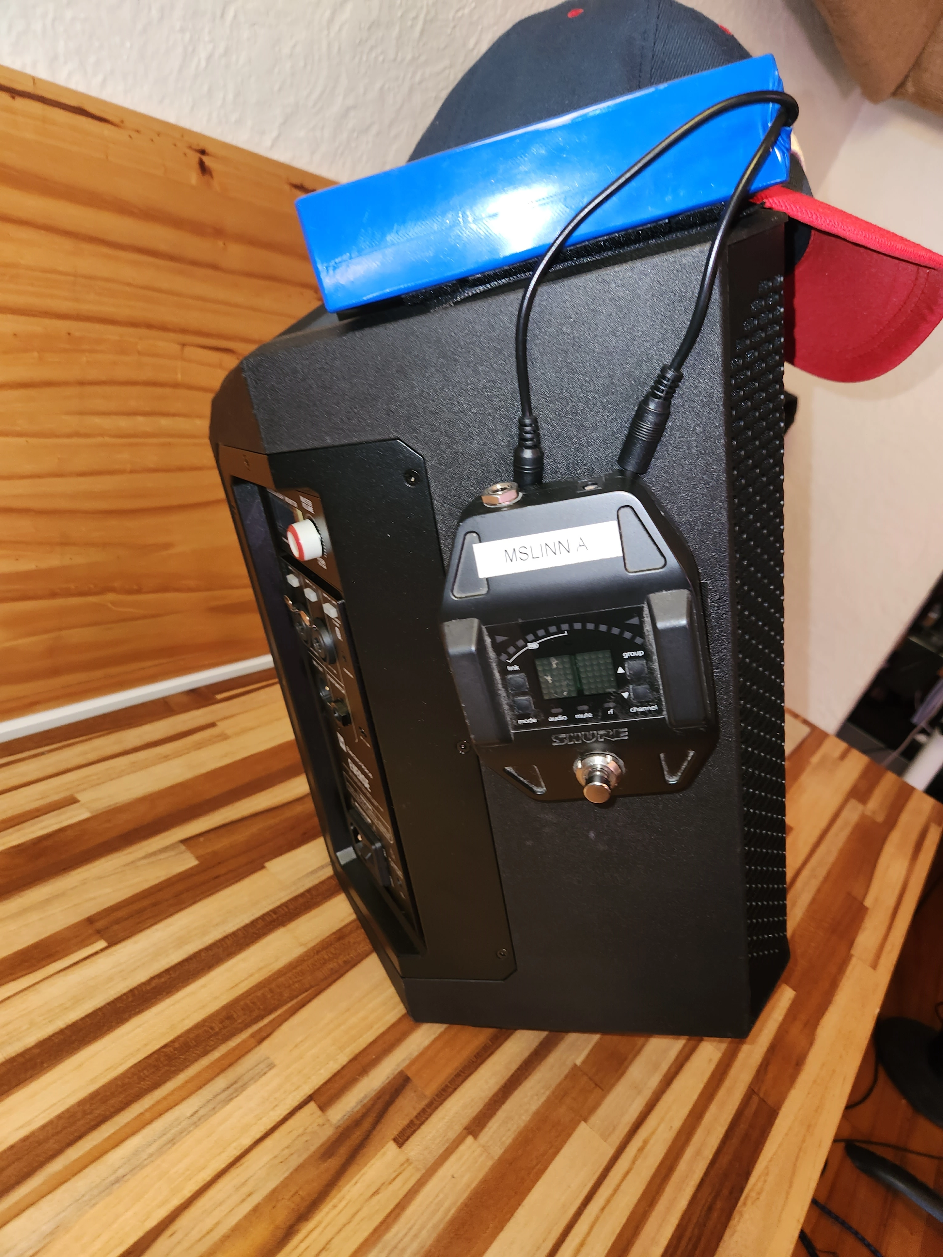 The following images show my EVERSE 8 with a Shure GLXD6 receiver and a blue 12 VDC battery for the GLXD6. The battery provides power for days; it is overkill, but I am thinking of adding a small mixer, which will probably need power as well.