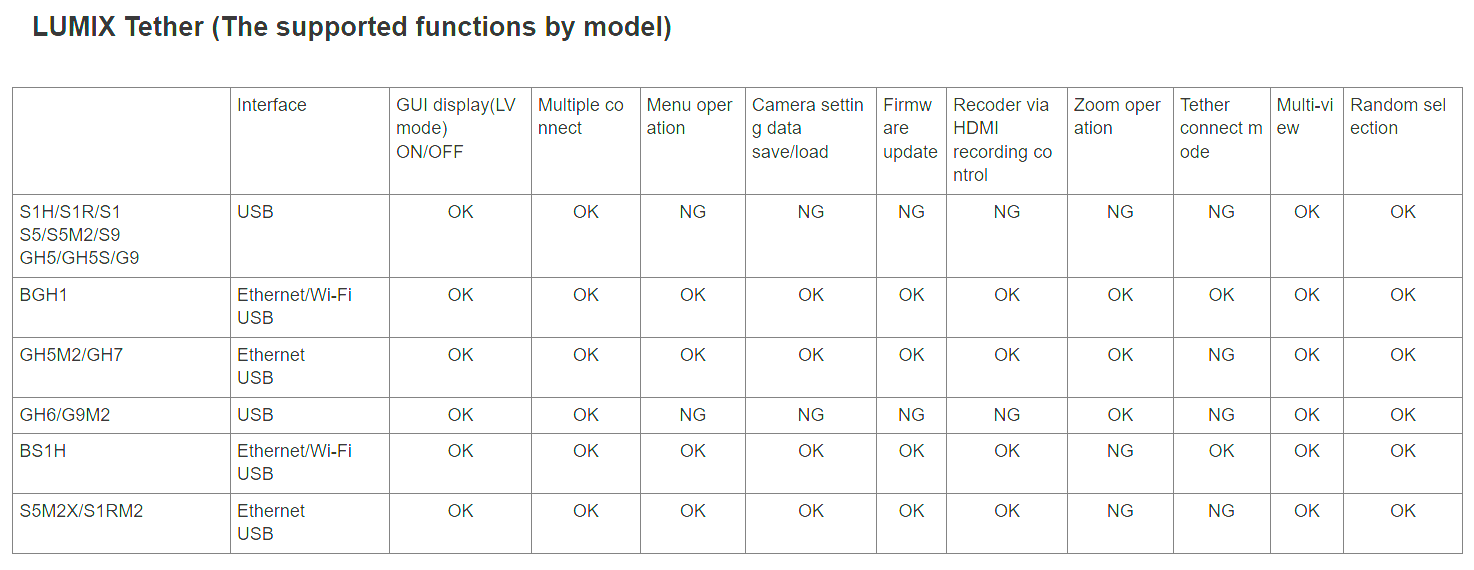 Panasonic’s free LUMIX Tether v2.9, updated 2025-03-11, has a support matrix that shows support for the DC-S5M2 and DC-S5M2X. The supported functions by model are a welcome update.