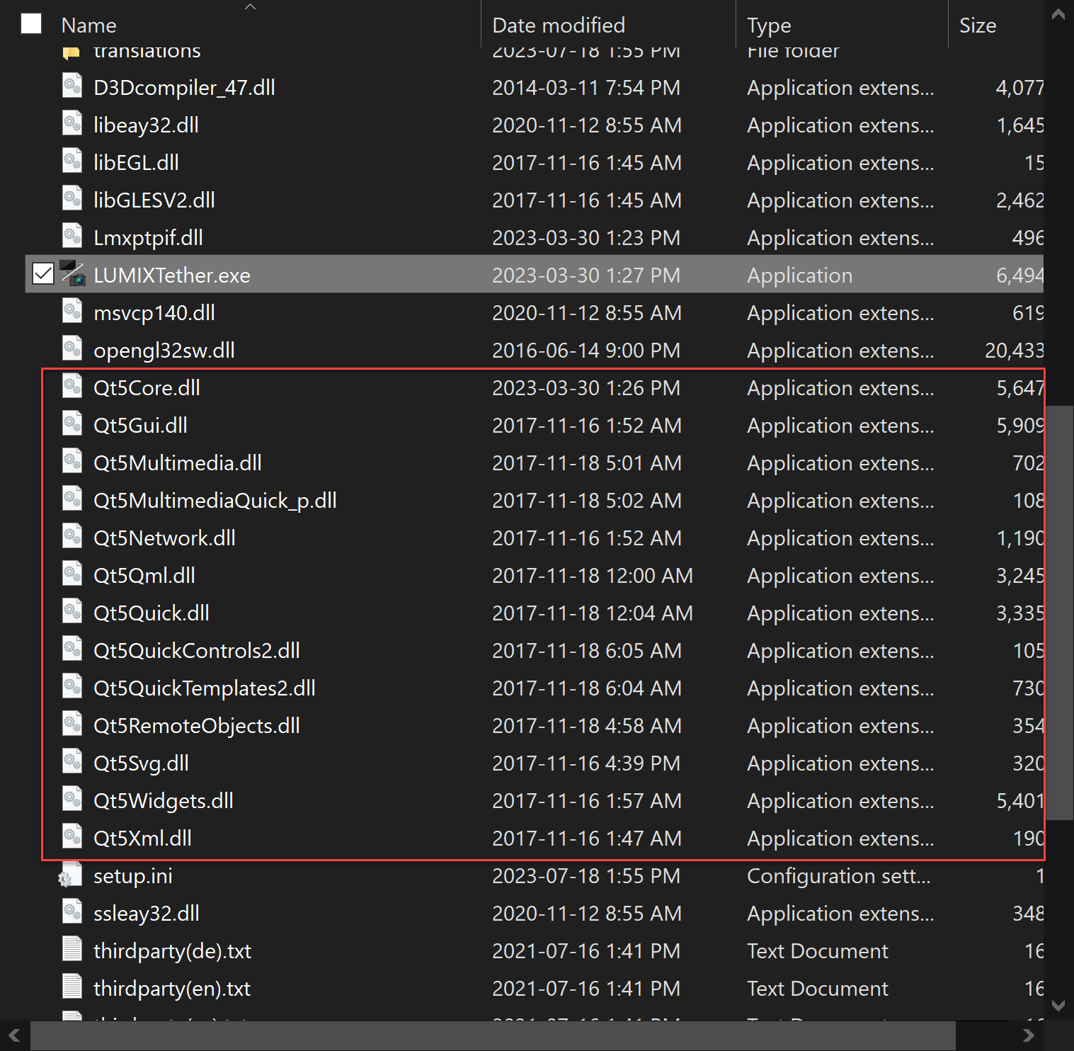 You can readily see that Lumix Tether uses the Qt 5 dependency: