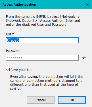 For Wi-Fi access, you will need to authenticate each time using the user name and password displayed on the camera. Instead, the camera and the remote control app should recognize each other.