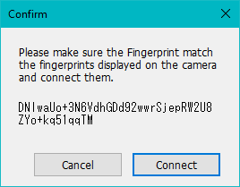 Confirm that the fingerprint displayed on the computer matches the one displayed on the camera, then click Connect. This appears each time you connect the camera. There is no reason for this. Another time-wasting annoyance.