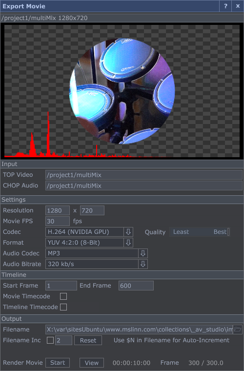 The Movie File Out TOP saves a TOP stream out to a movie file (.mov/.mp4) using a variety of codecs, including the H.264/H.265, Hap Q, NotchLC, Apple ProRes and Animation video codecs. It can also save single frame images, image sequences, or stop-frame movies.
