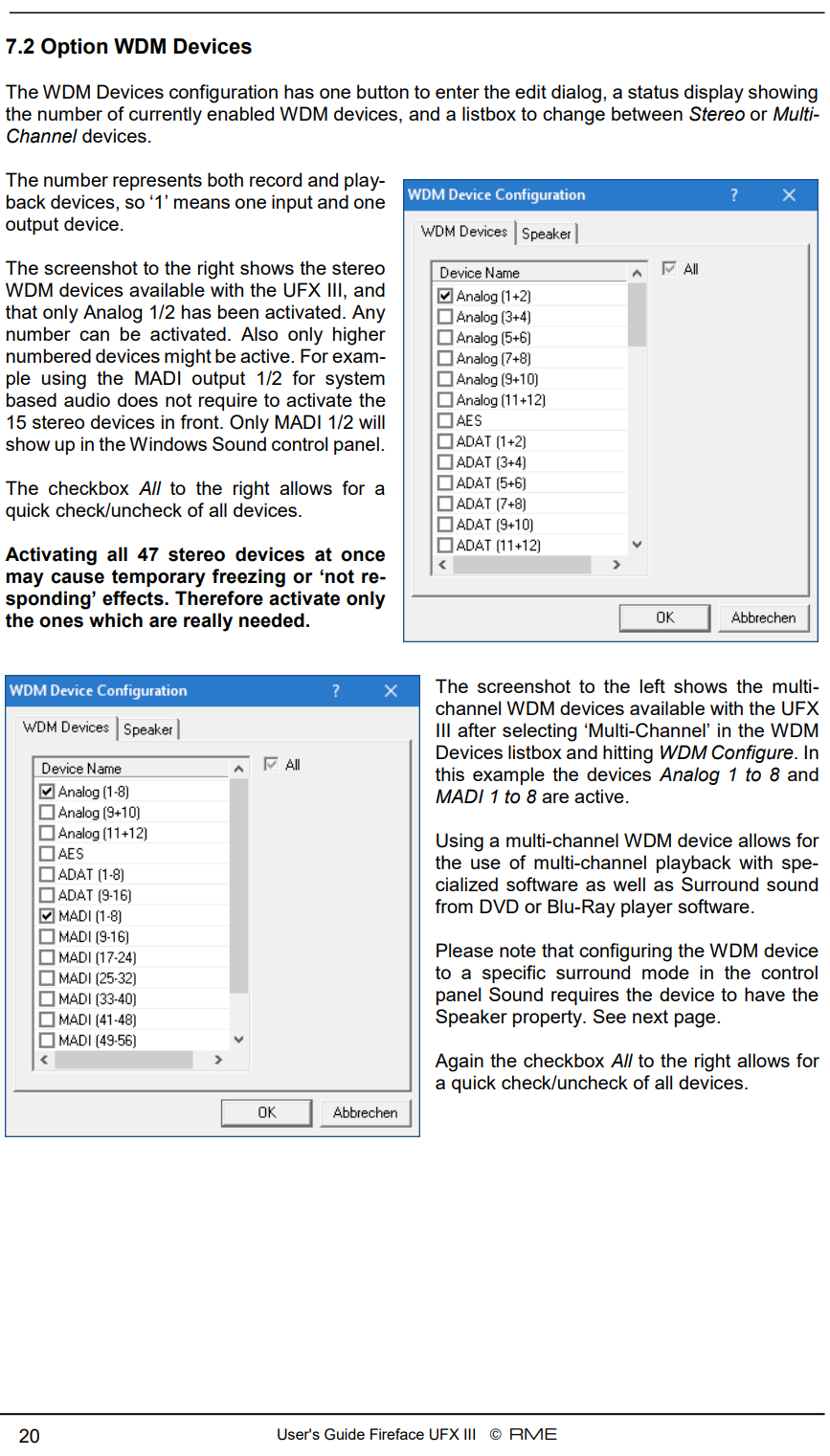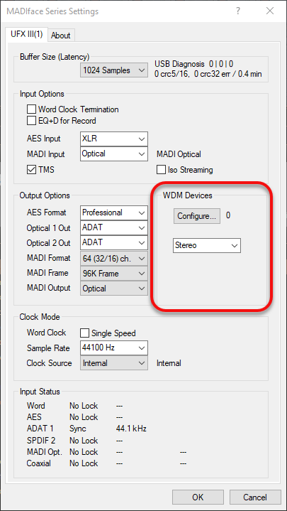 When I looked at the MADIface Settings applet, I saw the number 0 in the area where WDM Devices are reported and configured. This number was a count of the number of defined WDM devices. I know that earlier that day, the number must have been at least 1 because I was listening to music. Because of the memory loss incident, the previous WDM device was forgotten.