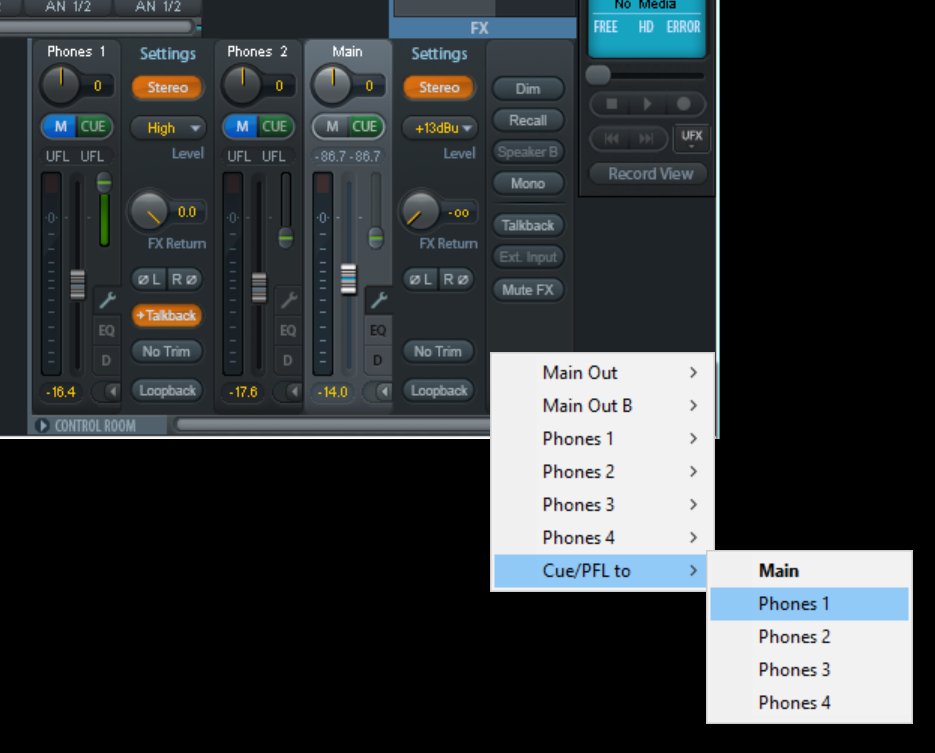 Clicking on the CUE button again reverts the submix sent to the headphones to the normal Phones 1 submix and restores the CUE button to its normal dark green color.