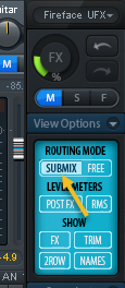 If the output faders refuse to be highlighted, then the mix cannot be adjusted. The solution is to enable Submix routing mode by enabling the SUBMIX button, as shown in the image to the right.