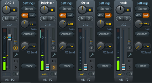 - Default: AKG1 for room ambiance, Audix for singer 1, Audix2 mic for singer 2, Behringer for singer 3, Mic 11/Guitar for guitar, Guitar2 input muted, Bass Amp, Guitar Amp, Roland HPD-15.