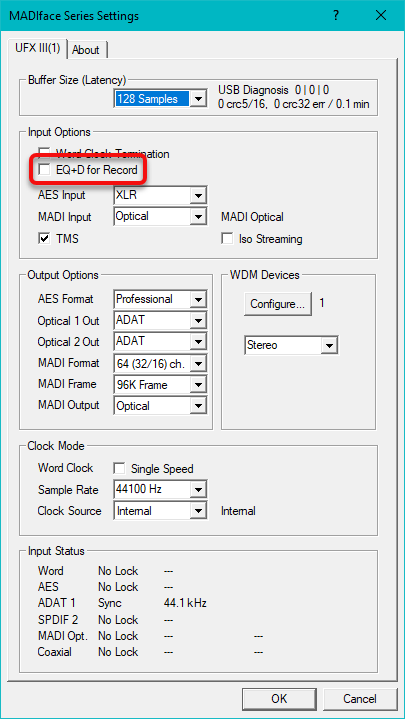 When the Fireface/MADIface Settings applet opens for the first time, it will look like the image below. Enable Input Options / EQ+D for Record.