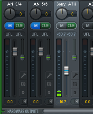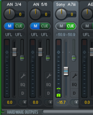 Now, wearing the headphones, when I click on the dark green CUE button in the Sony A7iii submix panel, the CUE button becomes bright green, and I will hear the submix that is being sent to the camera.