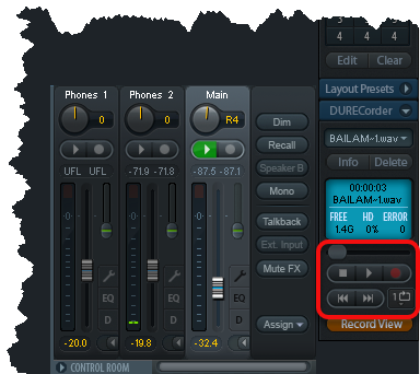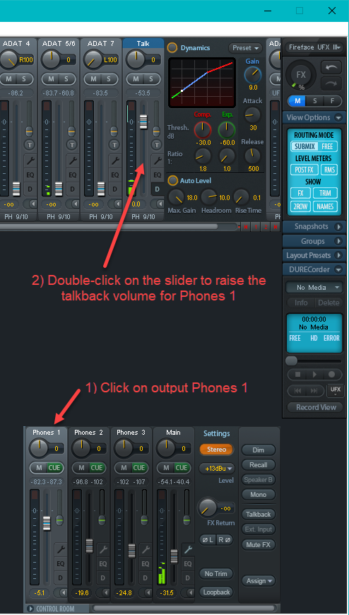 The TotalMix user interface for Durec is user hostile. Essentially, you need to: