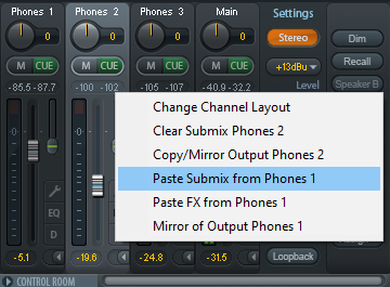 I then right-clicked within the Phones 2 subpanel and selected Paste Submix from Phones 1 from the pop-up menu. Now, the submixes for Phone 1 and Phone 2 are the same.