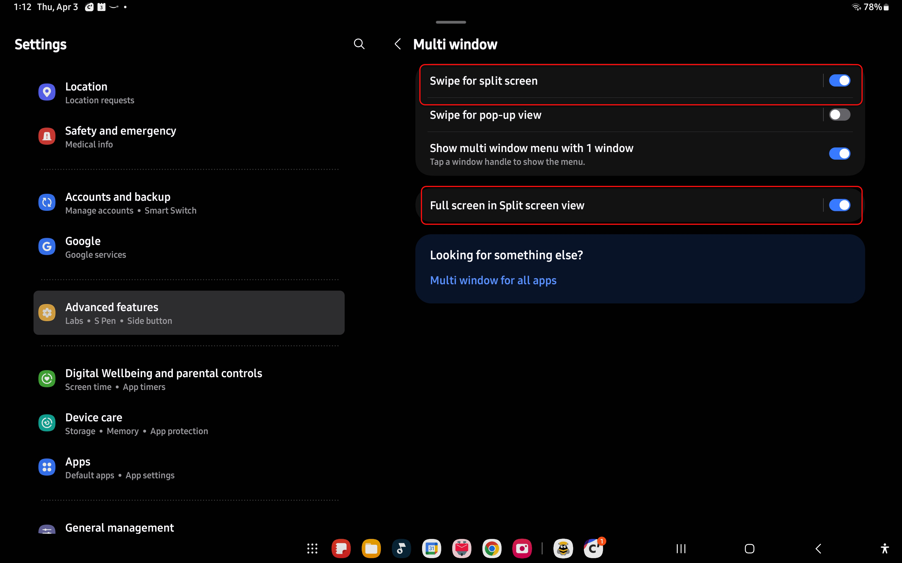 You can optimize split-screen functionality by going to Settings / Advanced Features / Multi window and enabling Swipe for split screen and Full screen in Split screen view.
