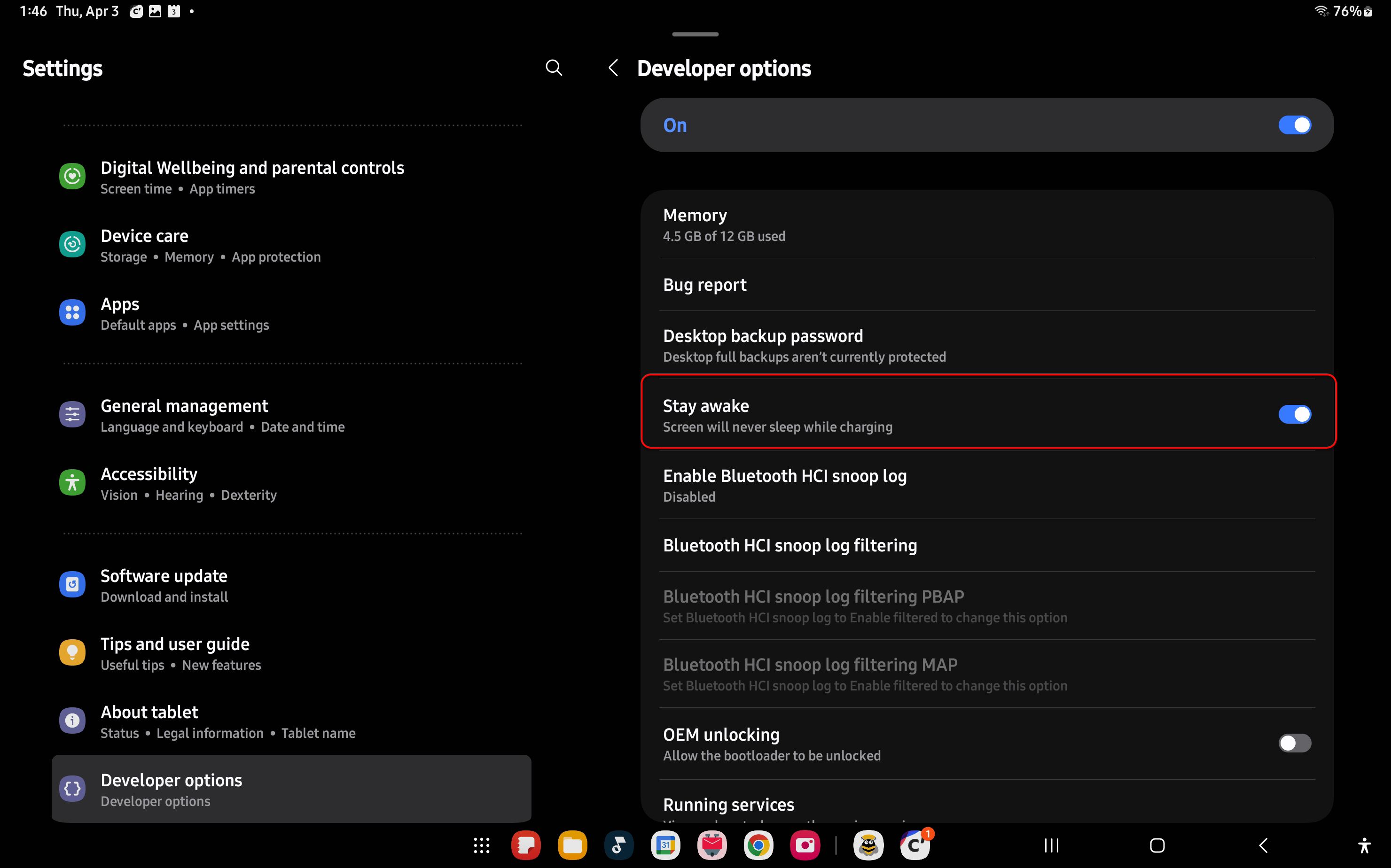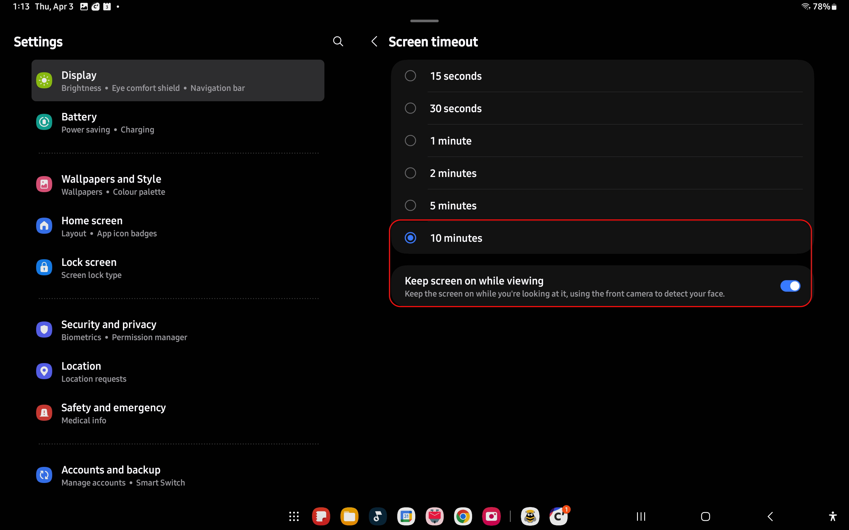 You can use the tablet camera to keep the screen on while it detects a face, as shown above, but to completely disable the screen timeout: