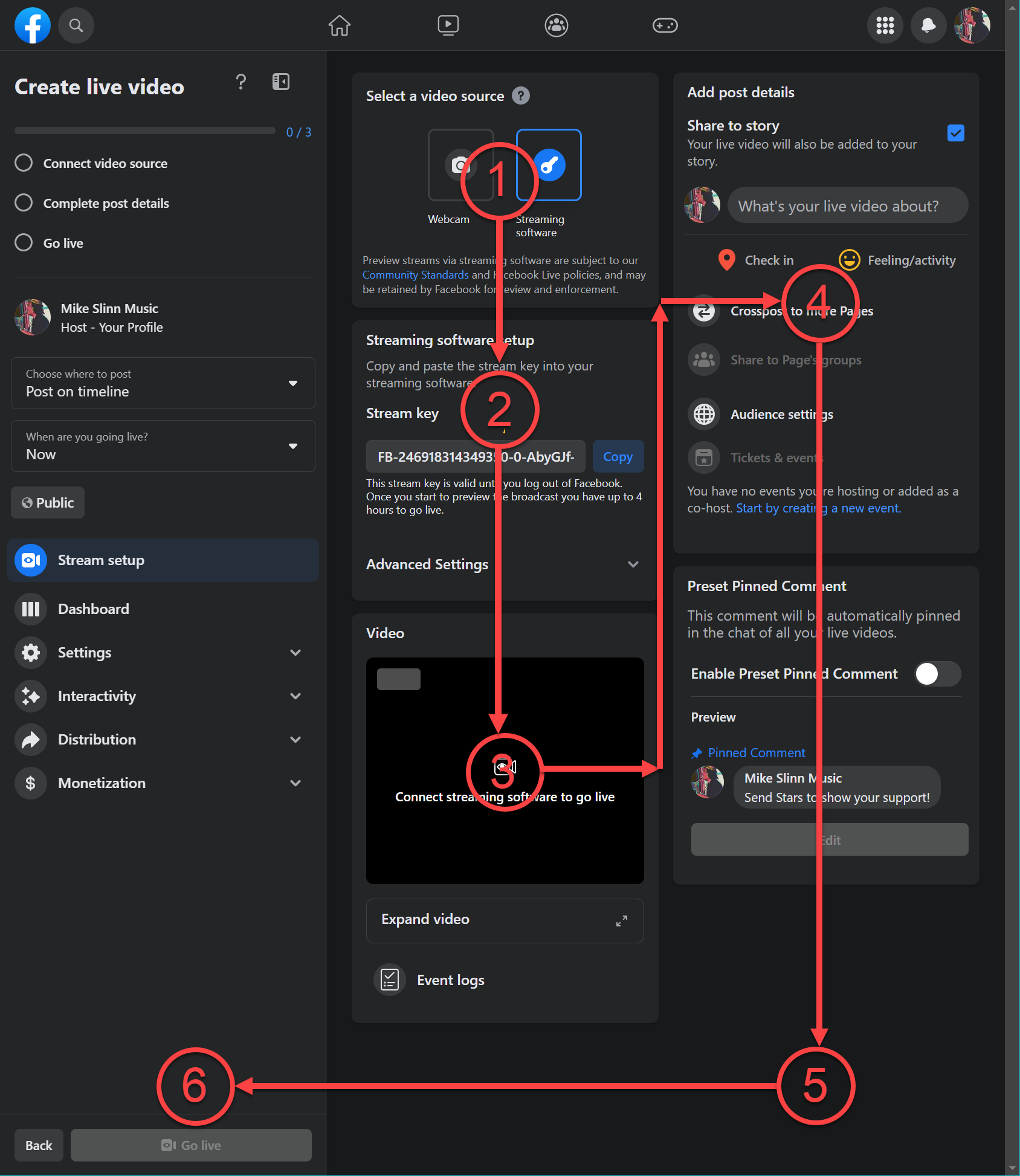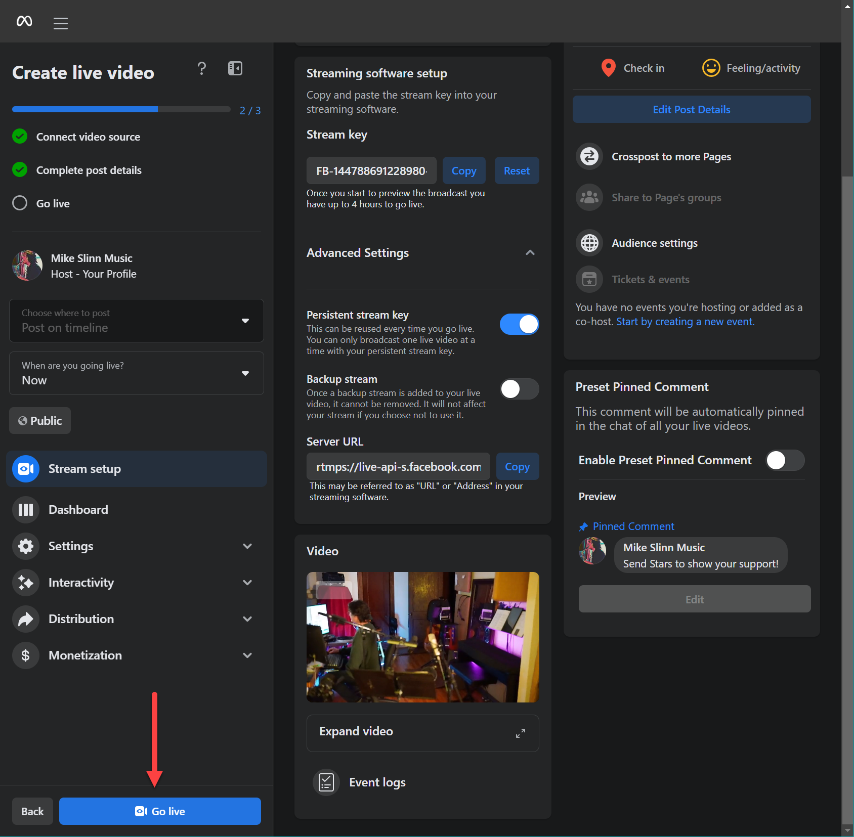 I found that the next step was also not intuitive. In the following image, the red arrow at the bottom left points to the Go live button. That button does what you might expect. Press it – and you will be streaming live on Facebook!