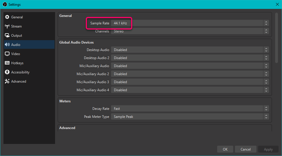 This panel can be accessed at File / Settings, then selecting the Audio tab. This is how I configured OBS Studio’s Audio: