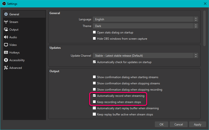 You can configure OBS Studio to start recording when streaming starts, by going to File / Settings, then selecting the General tab: