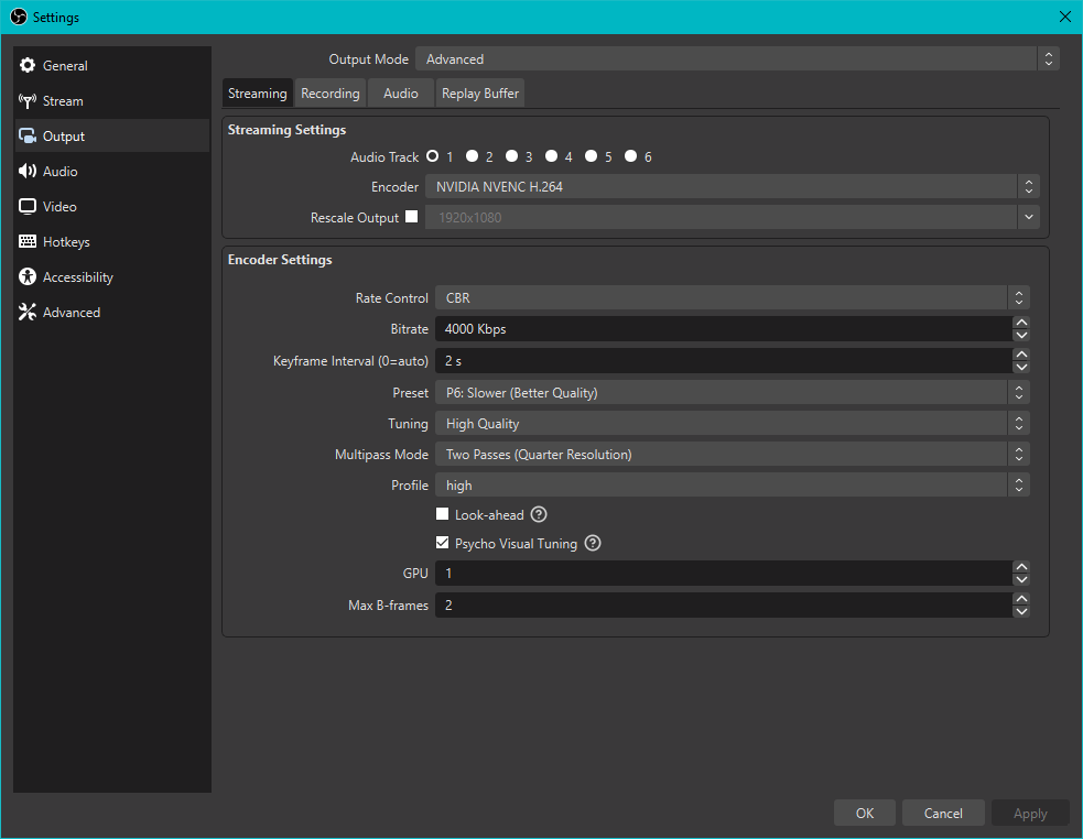 { "bitrate": 4000, "gpu": 1, "keyint_sec": 2, "lookahead": false, "multipass": "fullres", "preset2": "p6" }
