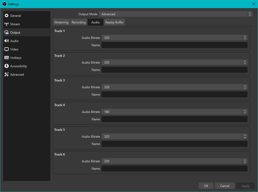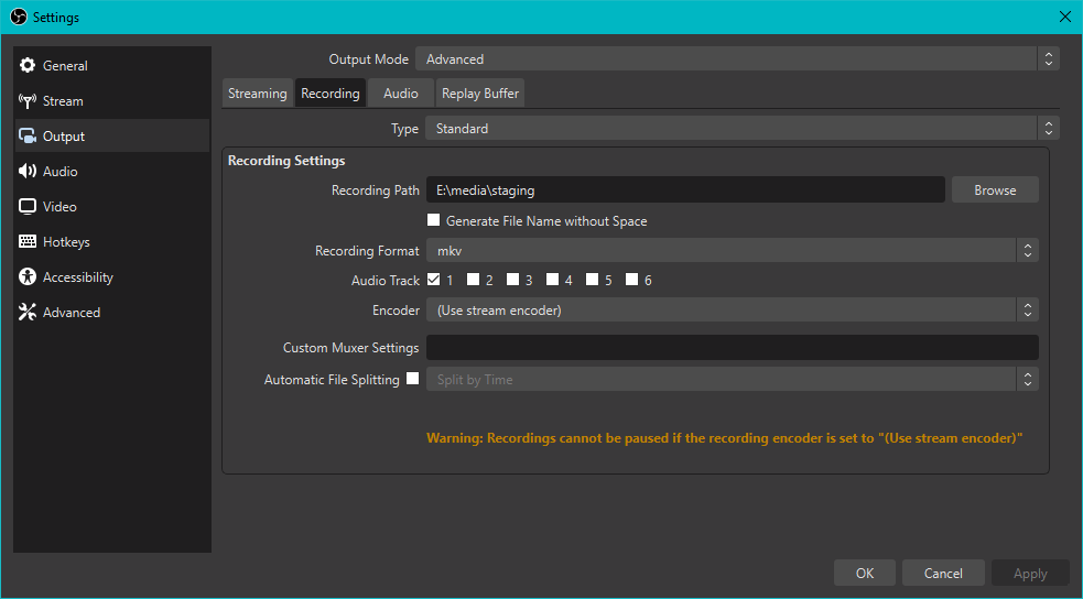 This panel can be accessed at File / Settings, then selecting the Output tab. It shows two choices for Output Mode: Simple and Advanced. Select Advanced; you now see four tabs below Output Mode. This is how I configured OBS Studio’s Output.