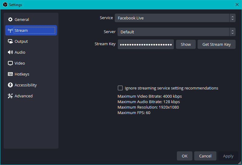 Press the Copy button as shown in the above image to copy the Stream key to the clipboard. Provide this value to OBS Studio by going to File / Settings / Stream, then select Service Facebook Live, and paste the Facebook persistent stream key into Stream Key as shown below.