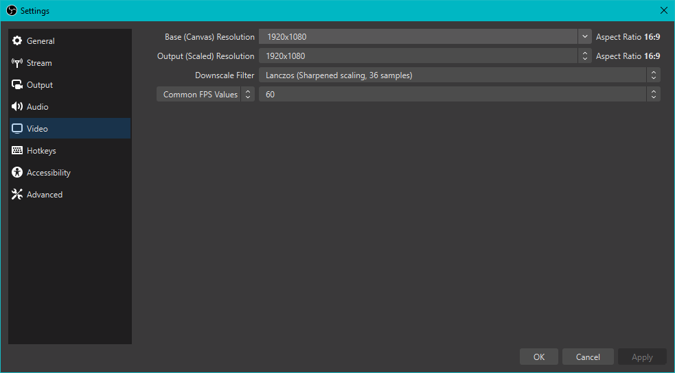 This panel can be accessed at File / Settings, then selecting the Video tab. This is how I configured OBS Studio’s Video: