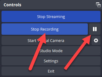 If you configured OBS Studio to start recording when streaming starts, you might want to turn off OBS Studio recording while we get things working so you do not fill up your hard drive with useless video. To do that, just click on Stop Recording in OBS Studio or click on the pause recording button ⏸︎ next to it.