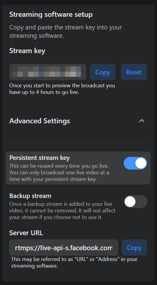 In Facebook Live, open up Advanced settings in the Streaming software setup section and enable Persistent stream key. I pixelated the Stream Key for security.