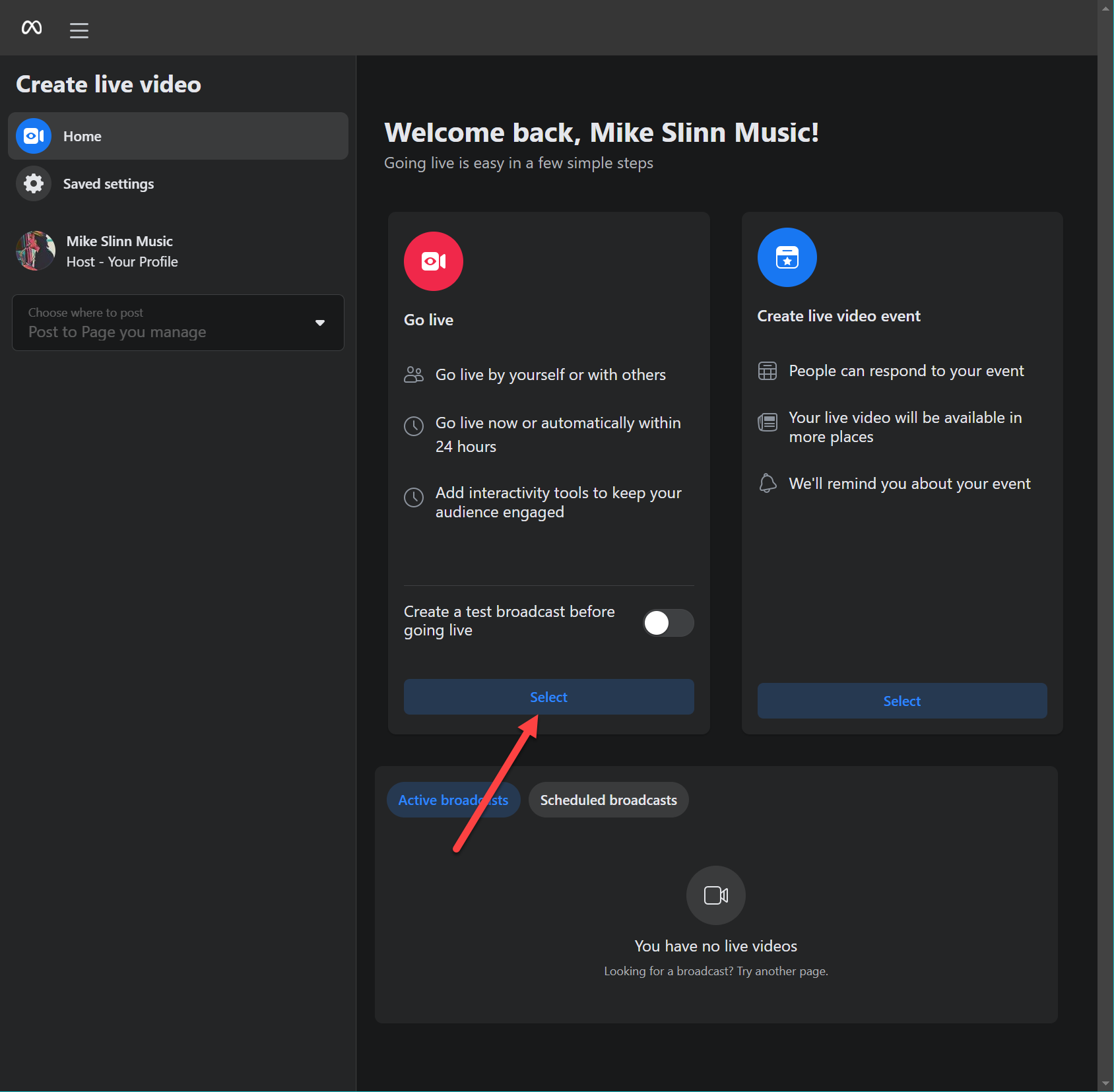 Click on the Go live Select button as shown above. The red arrow points to the button you need to press.