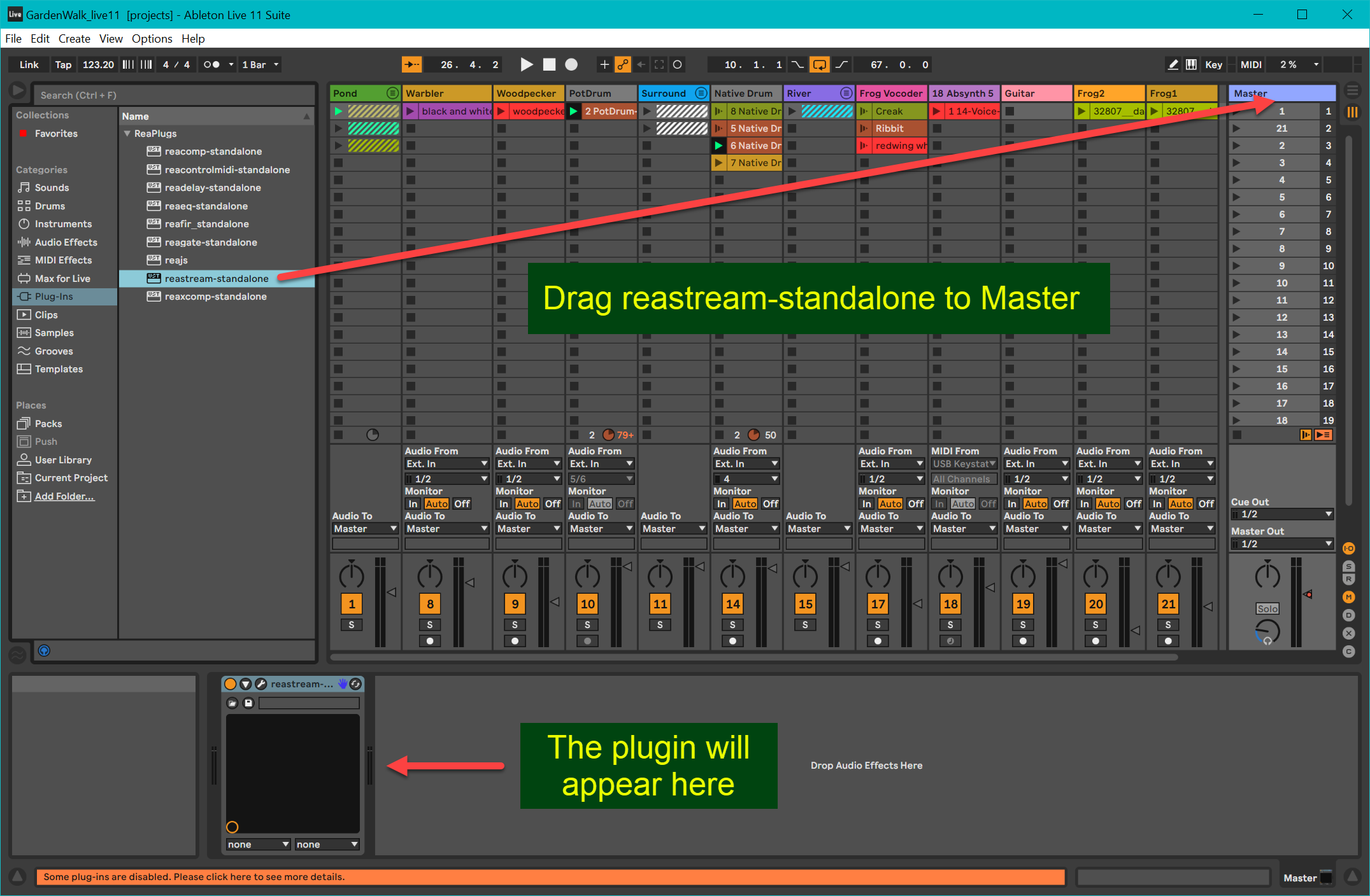 Ableton’s audio settings do not need to be changed. Instead, for each Ableton Live session that you want to connect with OBS Studio, the ReaStream VST2 plugin is placed on the Ableton Live session’s master channel. ReaStream broadcasts the Ableton Live session master channel throughout your computer’s internals.