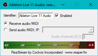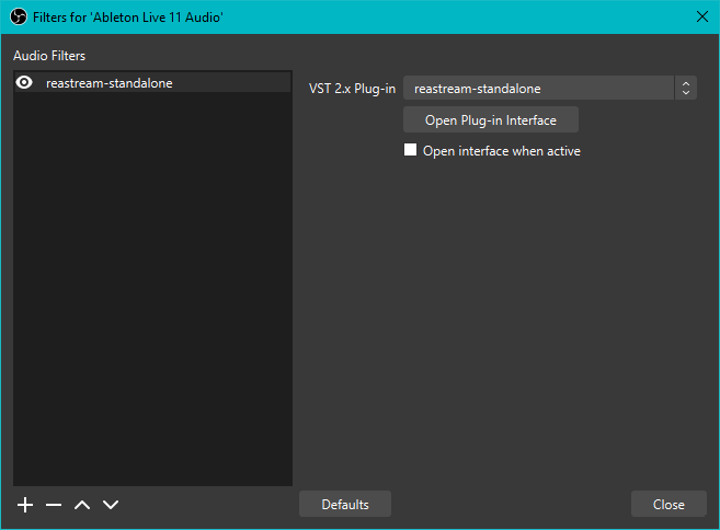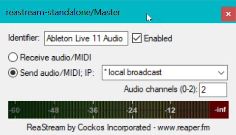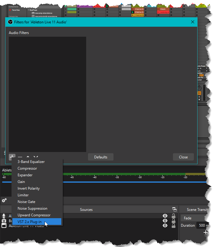 If Ableton Live is playing music, the meter in the OBS Studio ReaStream plugin should show audio now. You should verify that this is the case now.
