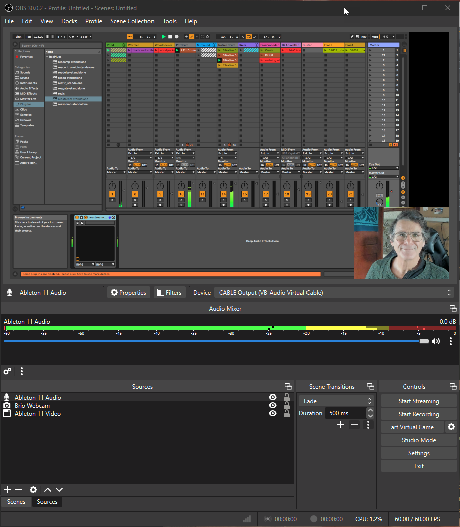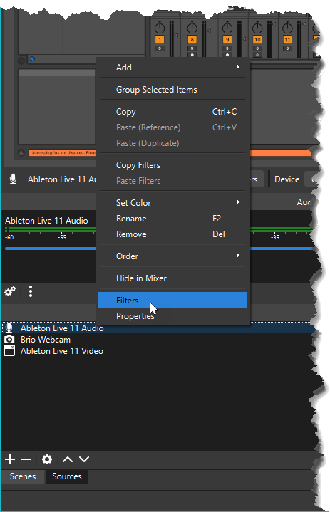 - Start OBS Studio and select or create the scene that you want to add Ableton Live audio to. I called my scene Ableton Live, Push and Talking Head. My scene already had a video capture device called Logitech Brio (a 4K webcam), and a window capture called Ableton Live 11 Video. Once these instructions were followed, I still needed to add an audio capture device for the webcam audio; that explanation is not part of this article.