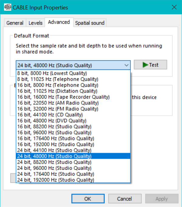 I used the VB-CABLE Virtual Audio Device to play the part of an audio device.