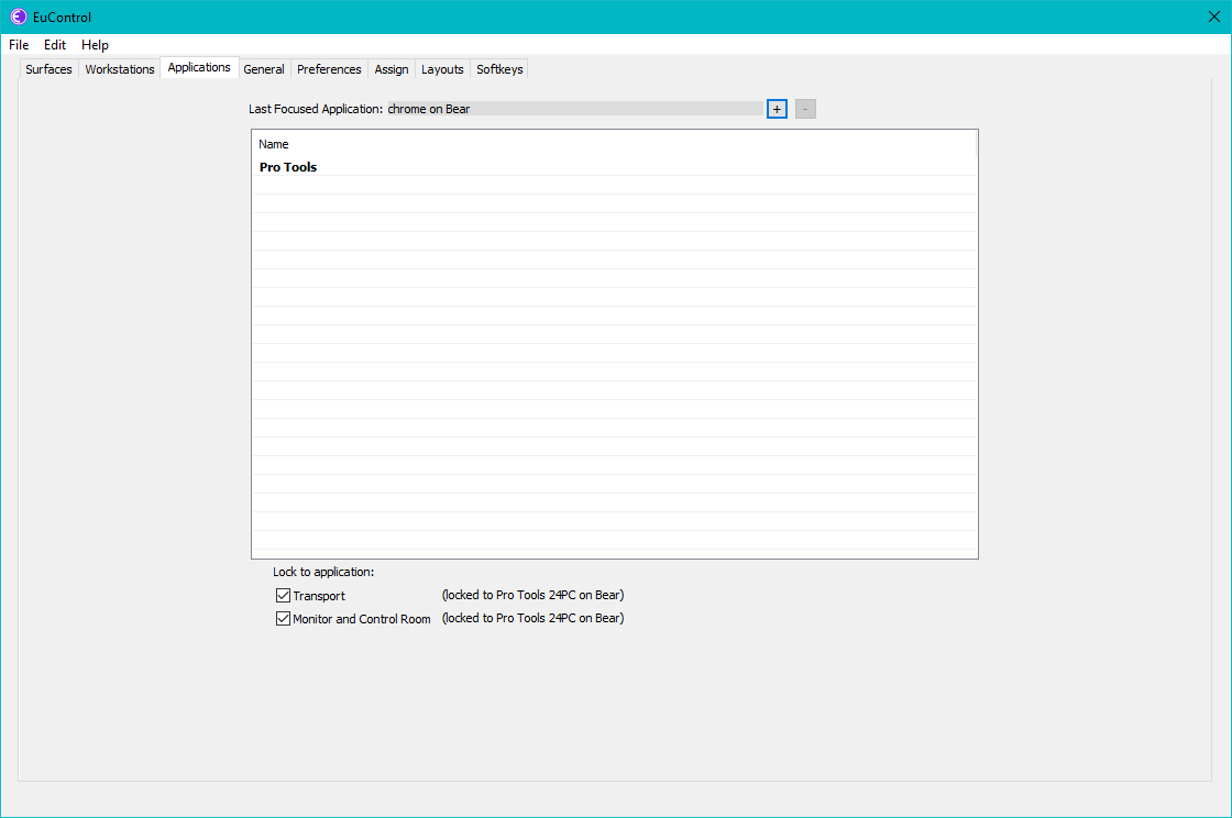 The solution: Under the Applications tab, set Last Focused Application to Pro Tools, then enable Lock to application: Transport and Monitor and Control Room.