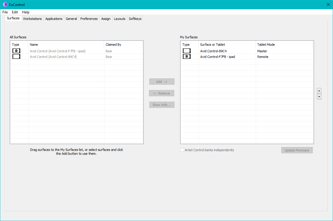 - In the Surfaces tab of EuControl, the tablet which should be in Remote mode from All Surfaces to My Surfaces.