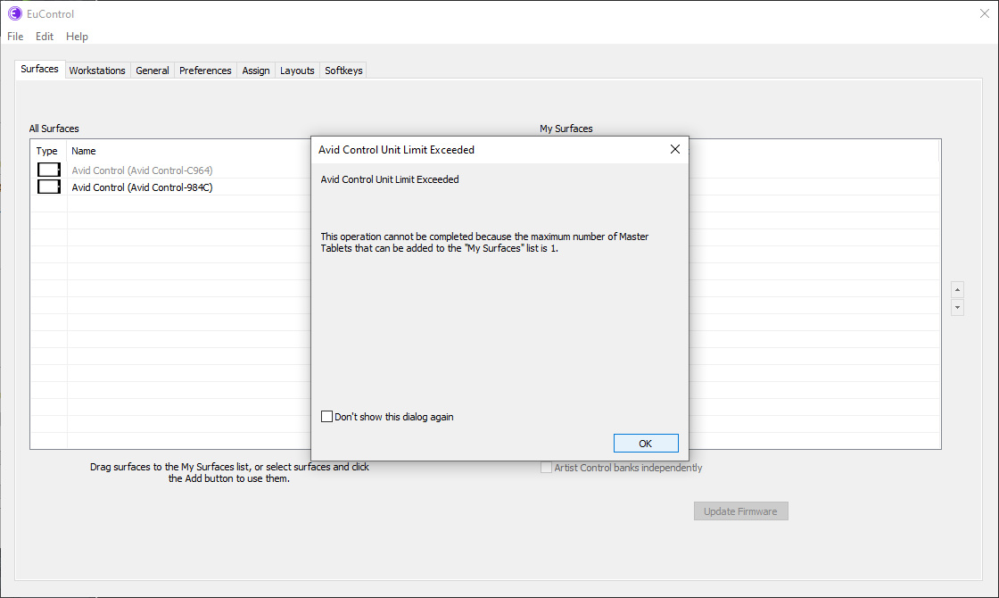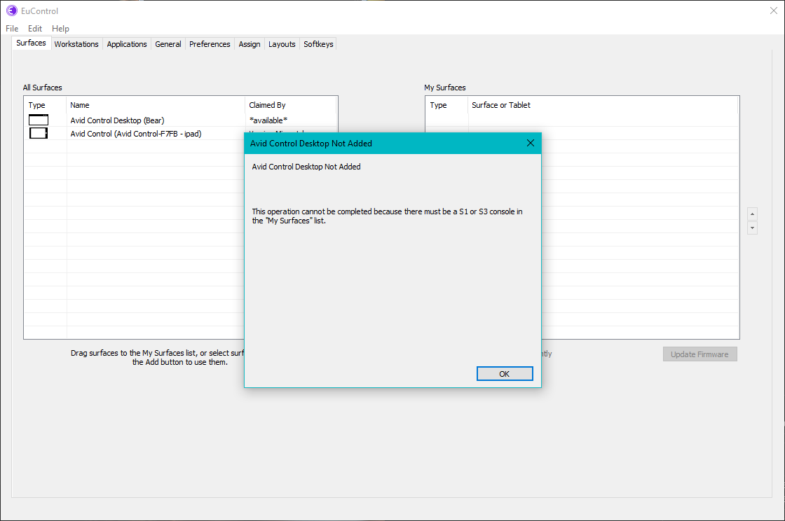 Whenever Avid Control, running on your tablet, displays a blank screen, your first instinct should be to check EuControl to see if My Surfaces shows all of the expected Avid Control instances.