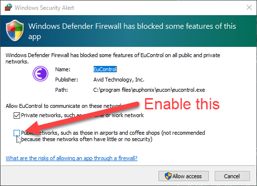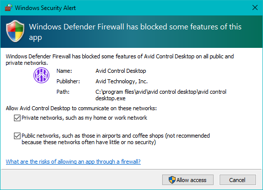 The first time you launch Avid Control Desktop, you will see a dialog presented by Windows Firewall. I opened the firewall so Avid Control Desktop could communicate on private and public networks.