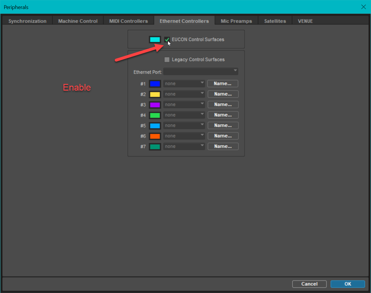 Setup / Peripherals, select the Ethernet Controllers tab, then enable EUCON Control Surfaces.