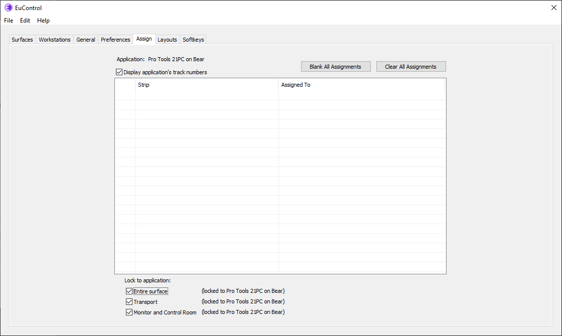 By default, Pro Tools must be the selected application on the DAW at all times. Otherwise, the Avid Control surface connected via EUCON does not display anything. To allow other programs to get focus without losing the connection, in EuControl / Assign, enable Lock to Application: Entire surface.