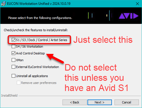 - Enable S1 / S3 / Dock / Control / Artist Series; this installs basic EuCon support for all control surfaces. If you have an Avid S1 or S3, then you can also install Avid Control Desktop. Otherwise, do not select Avid Control Desktop.