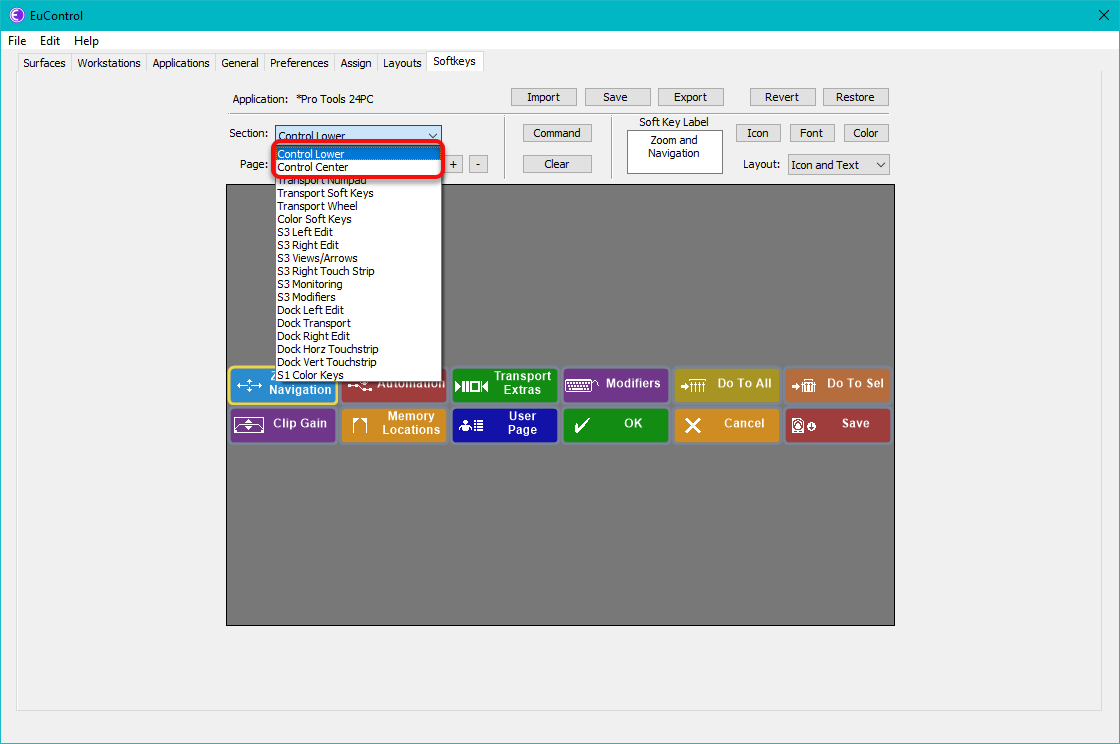 Soft keys can be defined and modified in the EuControl Softkeys tab. The Section pulldown menu contains several categories, but unless you have a physical Avid control surface, only the first two sections are applicable: Control Lower and Control Center.
