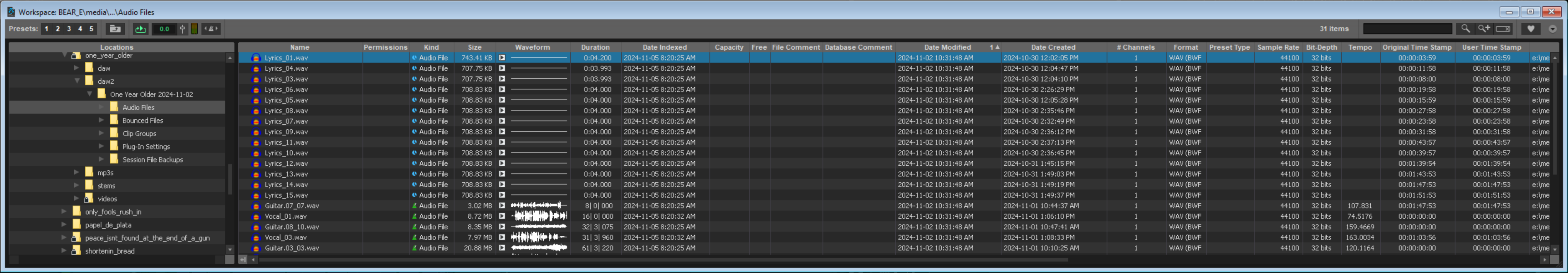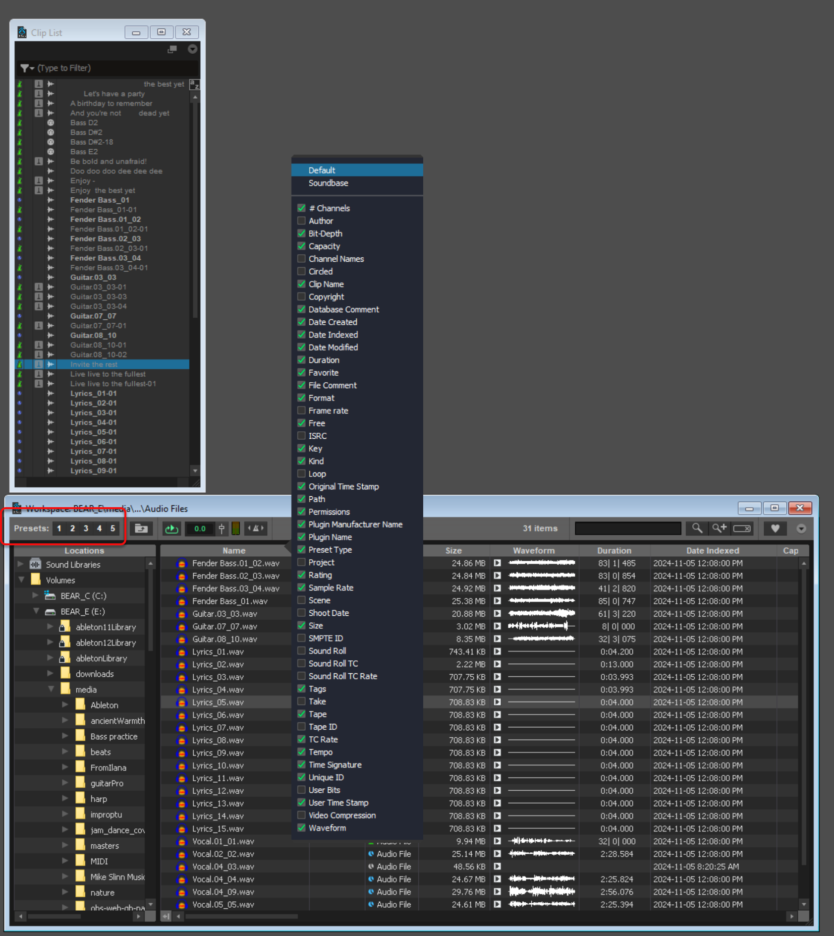 Instead of using the above hotkey to create a new workspace browser, it is often more convenient to select an audio clip and open a new workspace browser at the directory containing the clip. To do this: