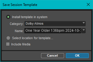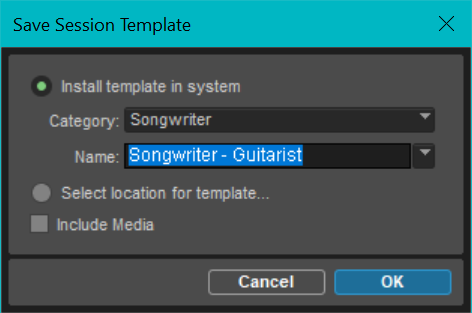 To save an open session as a template for new sessions, select File / Save As Template.... By default, the audio and MIDI data is not included in templates, unless the Include Media option is enabled.