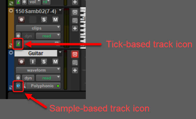 Tracks with a time base set to ticks will conform to the session tempo, with content on those tracks maintaining a fixed bar and beat position, taking any session tempo changes into account. Tracks with a time base set to samples will maintain a fixed position in relation to the session start.