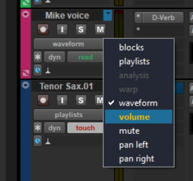 Slip mode should be enabled when working with automation. Grid mode will be particularly frustrating. Audio tracks and virtual instrument tracks can have volume automation applied; however, the value of the track view selector for each type of track is different.