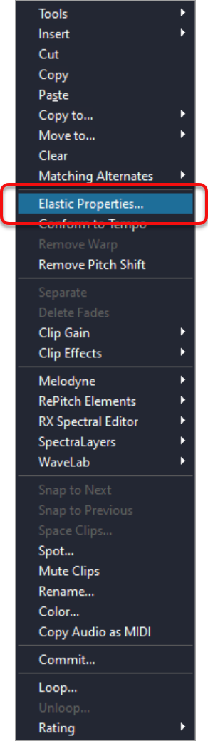 - Right-click on the clip in the track that needs to be pitch shifted and select Elastic Properties...