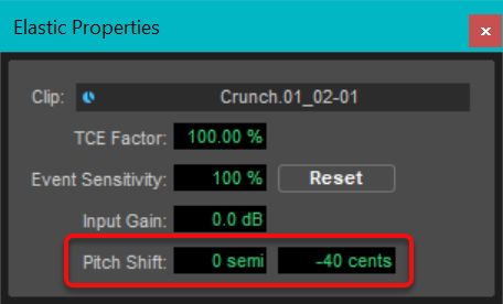 The Elastic Properties dialog contains two boxes whose values specify how much to shift the pitch of the selected clip.