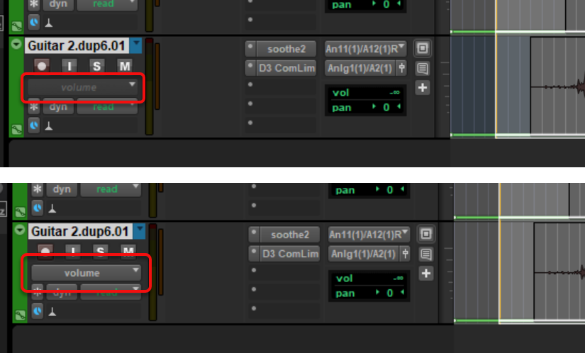 Below are two images showing almost the same track information. The only difference is that the upper image has dimmed the volume text, which indicates that the track as shown in the upper image has disabled automation. CTRL-clicking on the word volume enables the volume automation on that track.
